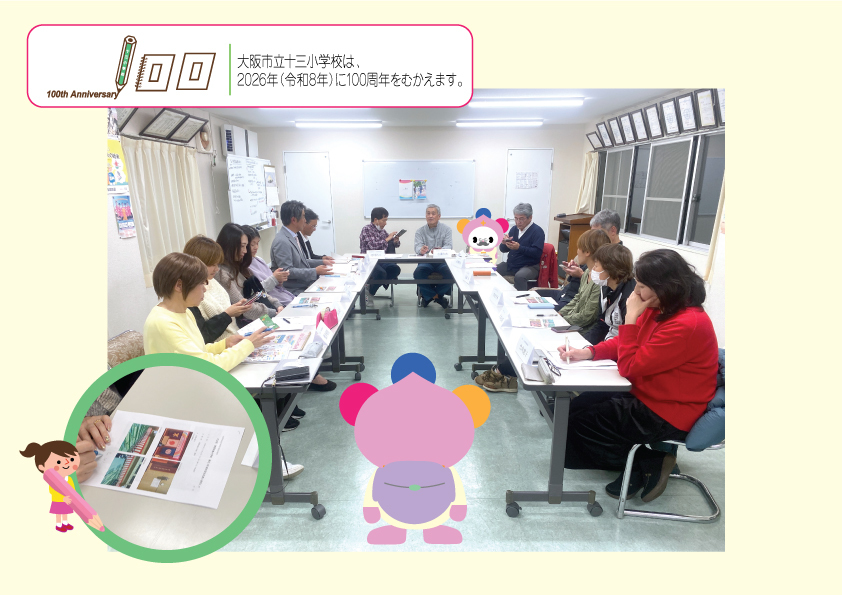 企画から運営、式典テーマや交流企画(十三小学校いまとむかし展)、記念品等について検討を続けています。